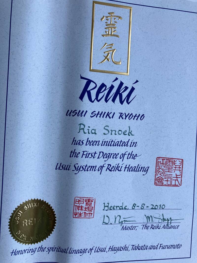 Toen dit ‘wonder’ zich nog een keer herhaalde (ik meen dat ze onze poes toen een behandeling op afstand gaf), wilde ik het ook graag leren. Ik volgde een cursus, kreeg een certificaat Reiki graad 1 en werd lid van het Reiki-groepje, waar Ingrid ook kwam. Eens per maand kom je bij elkaar, deelt bijzonderheden en geef je elkaar Reiki. Nu niet meer, omdat de locatie vlak bij huis weg is, en de terugkom momenten op woensdagmiddag zijn. Woensdag is wandeldag, dus dat ‘matcht’ niet… Met twee mensen uit de ‘oude’ groep organiseren we nu zelf Reiki-uitwisseling.