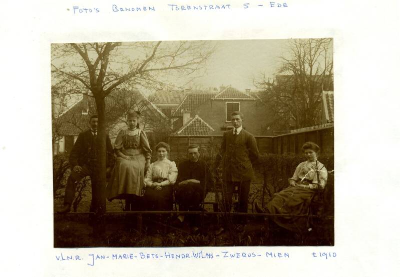 Zittend vlnr: Mien (geb 1889, 08.02.26), Bets (geb 1884, 08.02.23), Marie Mulder (v. oom Piet 08.02.22), Maria (geb 1893, 08.2A.28A (snoeknr)); staand: Zwerus (geb 1886, 08.02.24), Hendrikus Wilms 08.02.23, Piet (geb 1883, 08.02.22. Geen moeite, leuk om te doen. pappa. [Bron foto: Roelie Wilms, ingescande dia's van haar vader Berend Wilms; Roelie is dochter van Rie de Nooij en Berend Wilms, kleindr van Hendr de Nooij en Anna Brunink]