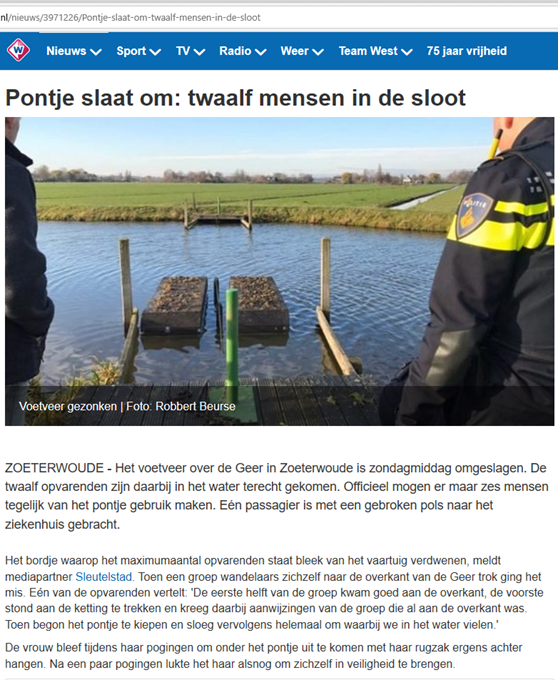 Op 1 december 2019 , tijdens een leuke wandeling over boerenlandpaden, zouden we ook met een trekpontje een sloot oversteken. Het was heerlijk winterweer, rond het vriespunt. Het bordje waar op stond dat je met maximaal zes personen tegelijk op de pont mocht, was weg. De wandelbegeleider liet ons in twee groepen van twaalf overvaren. De eerste groep haalde wonder boven wonder veilig de overkant, de tweede groep, waar ik bij zat, niet. Binnen een minuut sloeg de pont om. Met een paar anderen belandde ik ONDER het platte vaartuig. Met de rugzak nog op mijn rug en de zonnebril nog op. Ik zag geen hand voor ogen.