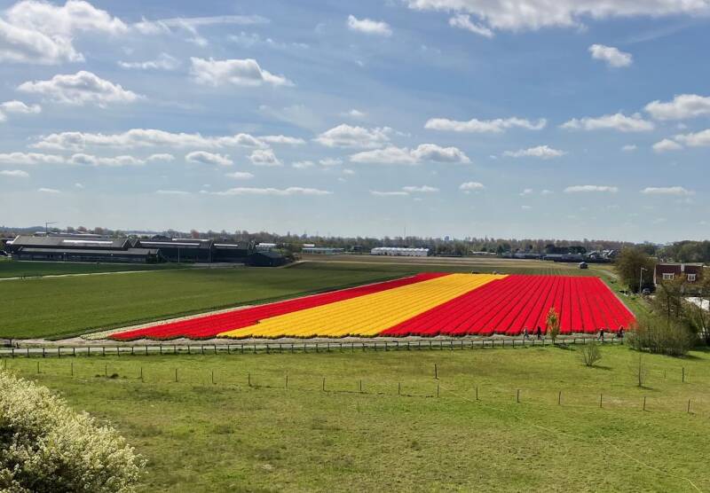 Het was alweer mooi weer. Van Noordwijk liepen we langs een paar bollenvelden naar de duinrand. We klommen naar de boulevard in Noordwijk en dronken koffie aan het strand. Gelukkig hadden ze tafels buiten voor ons gereserveerd.