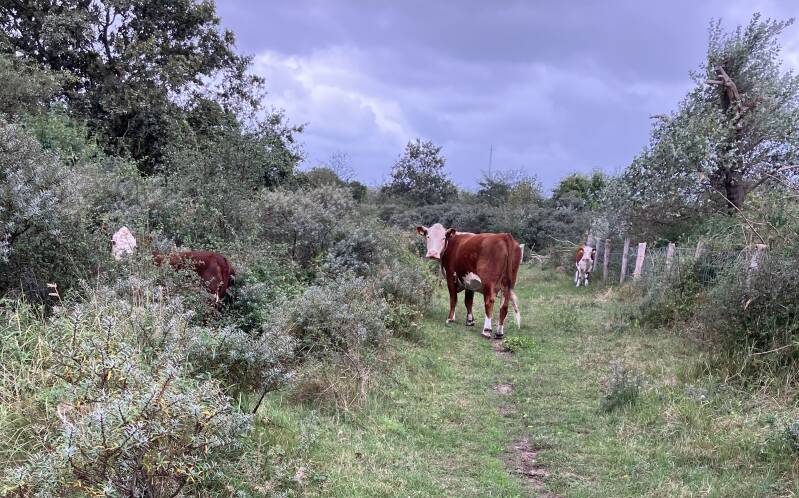 Na een korte stop in het bos stonden we oog in oog met twee koeien en een kalf.