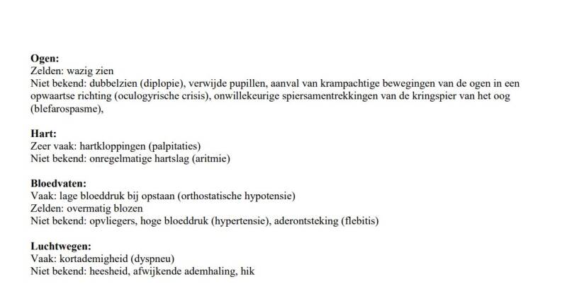 De medwerker (hoera - geen robot) begreep mijn vraag. Zij vond de bijsluiter van Sinemet, waarin als bijwerking van levodopa 'hartkloppingen' werden vermeld. "Dat is niet hetzelfde als een ritmestoornis of boezemfibrileren", wist ze.
