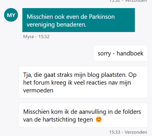 Maar ze zag ook dat AF (Atriumfibrilleren of boezemfibrileren ) gemiddeld vaker voorkomt bij Parkinson. (Googelen op Parkinson en Atriumfibrileren). "Een leuk onderwerp om te bespreken met je arts". Vond ze.