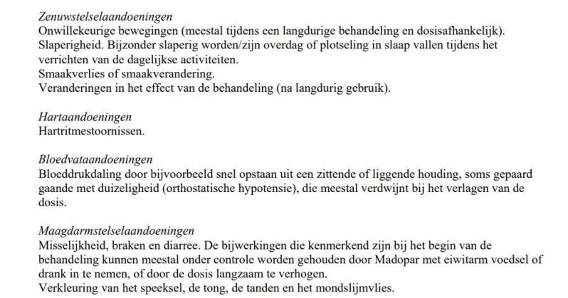 Toen ik onlangs de bijsluiter van de oplosbare madopar (levodopa) nakeek, zag ik tot mijn verbazing, bij de (lange) lijst bijwerkingen van madopar, staan : hartritmestoornissen!