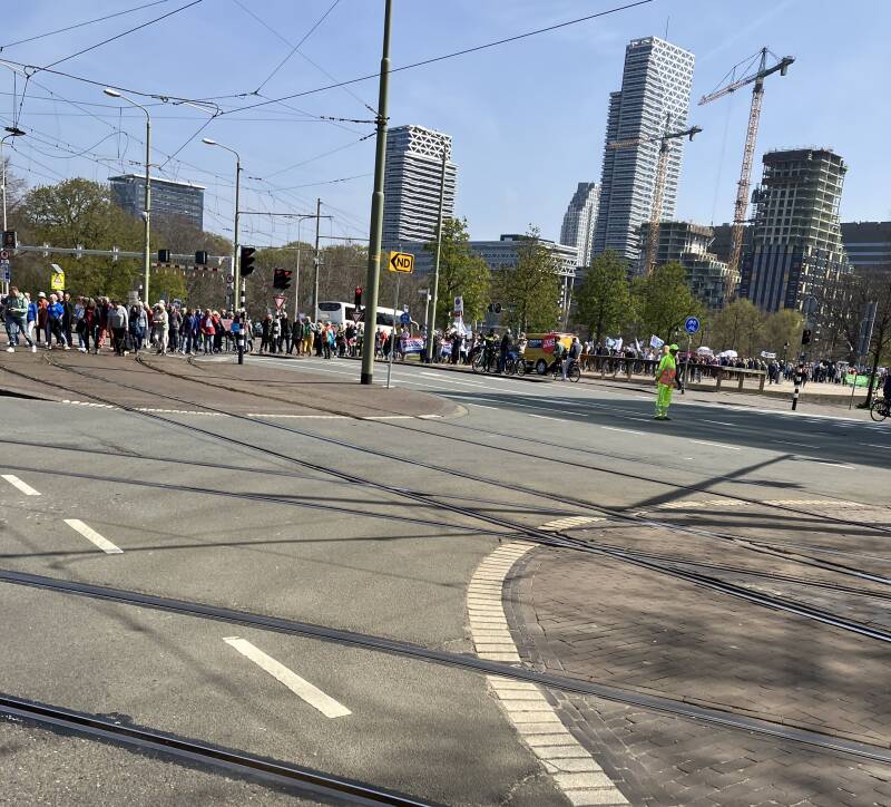 Om 13 uur begonnen de toespraken en klonk een mooi lied. Daarna gingen we 1,9 km lopen. Je kon ook voor een kortere route kiezen (1,1 km). Er was veel politie aanwezig, om automobilisten en ander verkeer tegen de houden op de plekken waar we langs liepen. Ook de trams moesten wachten tot we voorbij waren. Intussen kreeg ik moeite met het wel erg trage tempo. Ik begon wat te wankelen. “Raar lopen valt hier niet op” dacht ik nog, want er waren meer Parki’s. Ook milieu-activisten, grootmoeders-voor-een-betere-wereld, partij voor de dieren en de SP liepen mee.