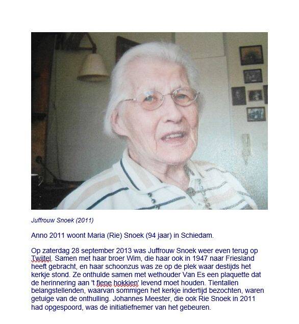 Vijf jaar geleden werd aan de Grindweg in Nijeberkoop een informatiepaneel over `t Fiene Hokkien onthuld. Het paneel werd door Snoek onthuld. Johannes Meester uit Nijeberkoop reisde voorafgaand de onthullig af naar Schiedam. Hij sprak daar met Snoek. Herinneringen over haar 7 jaar in NIjeberkoop werden op video vastgelegd.