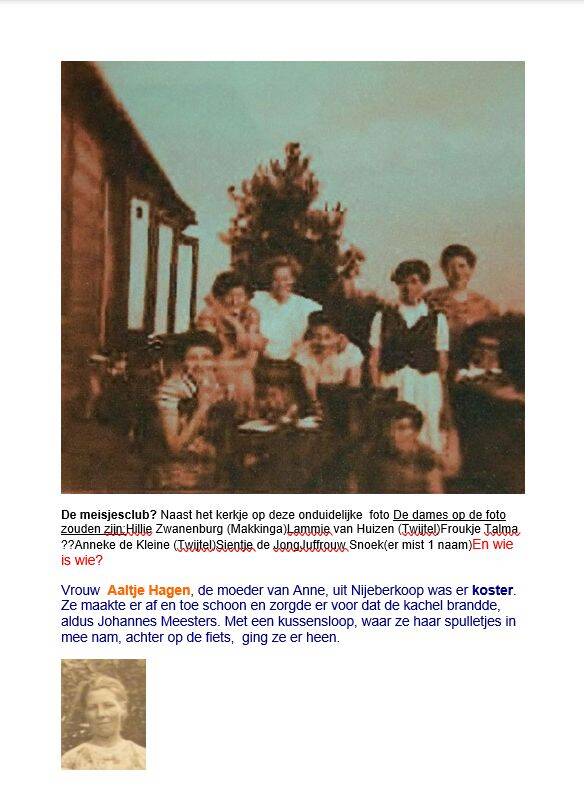 Intussen heb ik ook een website in de lucht over het buurtschap en daarop wordt ook de geschiedenis van het kerkje belicht. (www.twijtel.jouwweb.nl). Een paar extra foto’s zouden daarop zeker niet misstaan. Als u nog verdere aanvullingen heeft aangaande uw tante en haar werkzaamheden daar, dan houden wij ons uiteraard zeer aanbevolen.