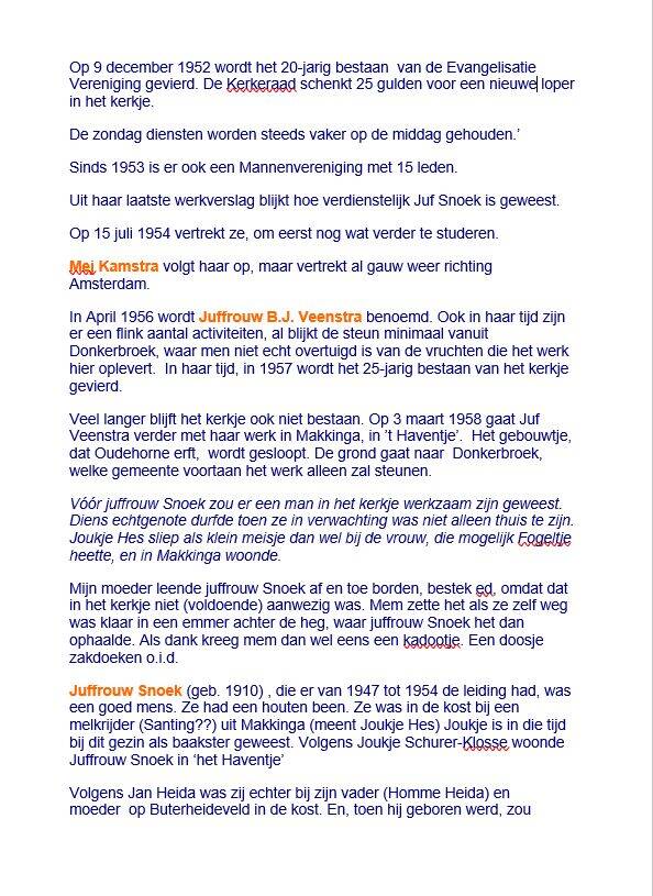Maria had het heel vaak over haar periode als evangeliste in Makkinga. Maar de buurt waar ze werkte heet nu Nijerbekoop. Johan Meester van de historische vereniging ontdekte via de stamboomsite (toen op Oryx, de site van neef Ge Snoek), dat ze nog in leven was en waar ze woonde. Contact en bezoek volgden. Een groot deel van het interview met haar is gefilmd. Maria genoot van het ophalen van herinneringen. Het deed haar ook goed, dat ze blijkbaar goed werk verzet had en indruk gemaakt had :-)
