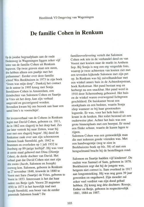 Verhaal over fam Cohen in Renkum; twee van hen komen voor in de autobiografie van Johan Snoek. Ze zaten volgens Johan ondergedoken in Renkum; toen ze geen onderdak meer hadden liepen ze de Rijn in en verdronken. Johans boek met het aangrijpende verhaal uit zijn dagboek, wordt in het artikel ook nog geciteerd. (De kopieën zijn door Jaap Meyer gestuurd aan Johan Snoek, geb 1920, Govertzoon)