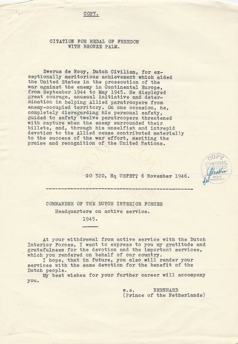Krant over Bennekomse gedecoreerde en verslag van de ceremonie in Amsterdam (Medal of Freedom van USA en Medal for Courage in the cause of Freedom namens de Britse regering)