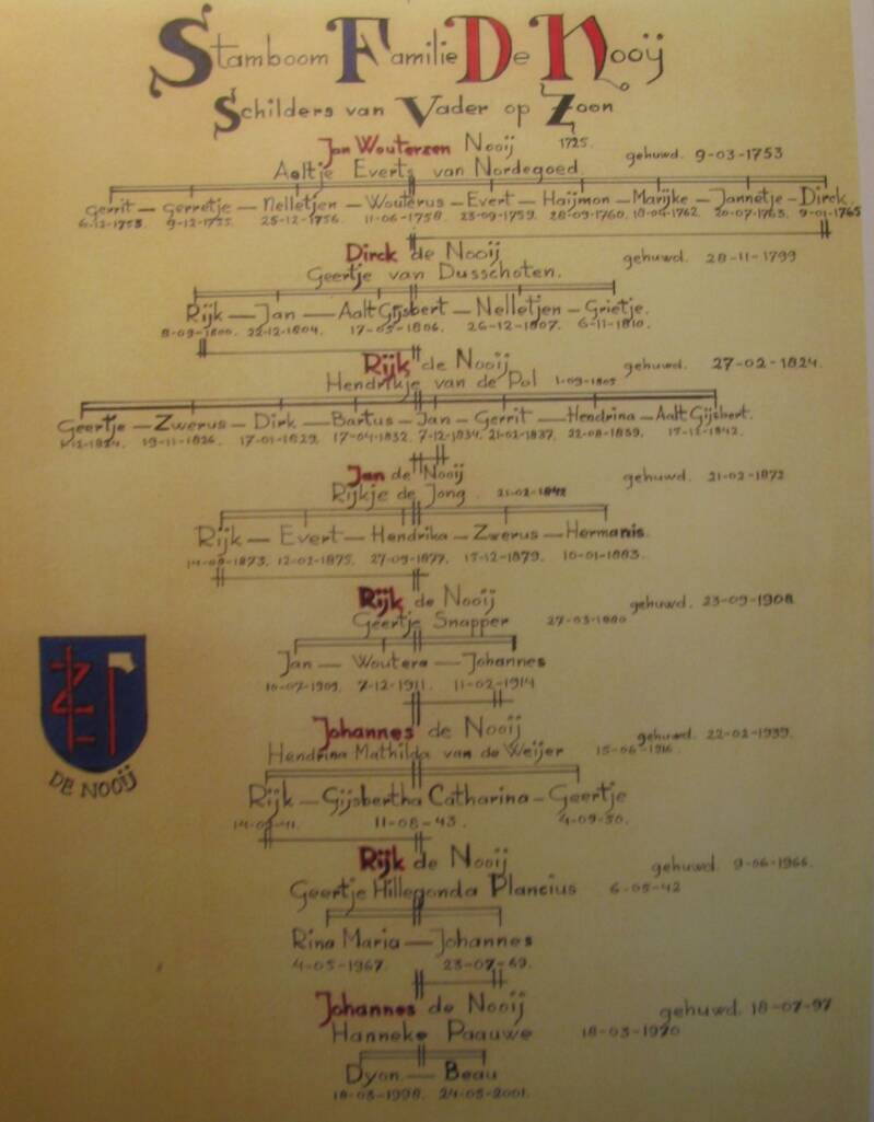 Stamboom Familie de Nooij, Schilders van Vader op zoon en een wapen (Nijkerkse tak). Rijk heeft de zaak overgedragen aan zijn zoon Johannes (Hans). Het blauwe wapen stelt gereedschap voor en is een alliantiewapen afkomstig van Adriaan de Nooij, Loosdrecht 1740. Meer over het alliantiewapen (een ander dan deze) staat in de familiekroniek, hfdst 2