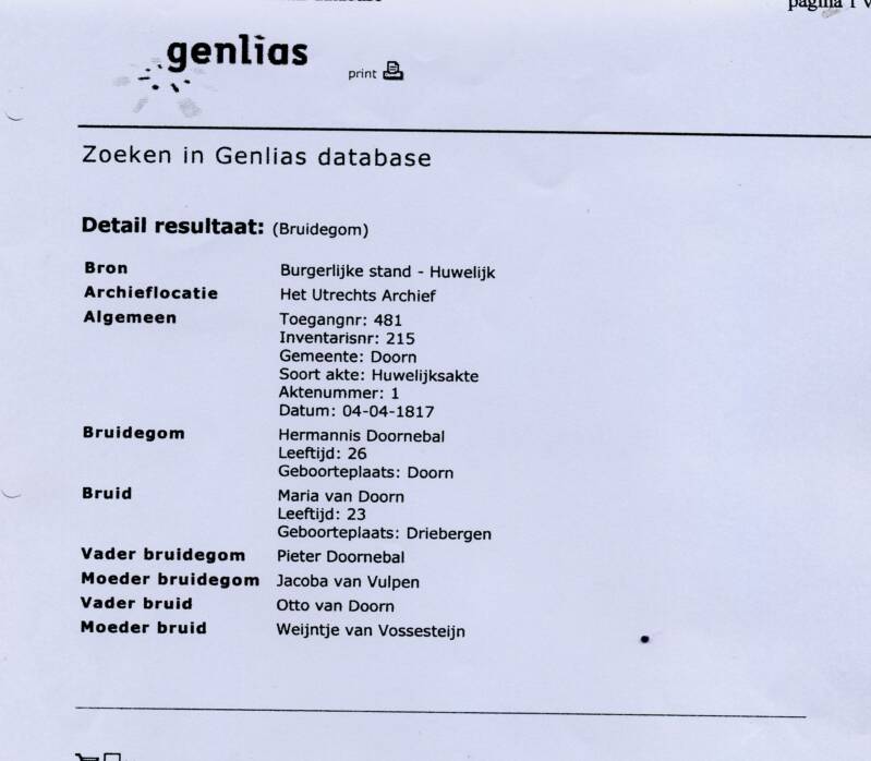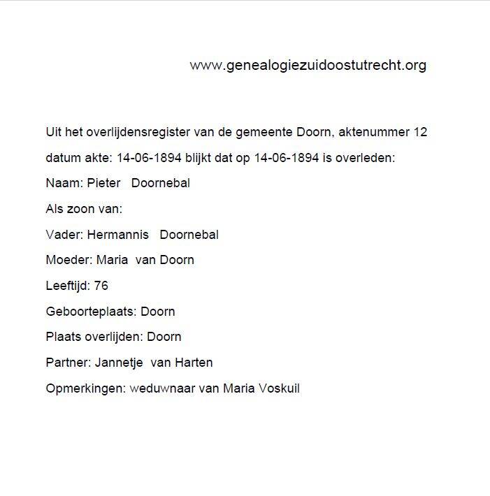In mijn stamboom stond Jannetje van Harten, geb. 30-08-1829, getrouwd met Pieter Doornen op 02-11-1854 in Ede met als bronvermelding Ede huwelijksakte nr. 7. Die gegevens had ik indertijd uit Genlias overgenomen.