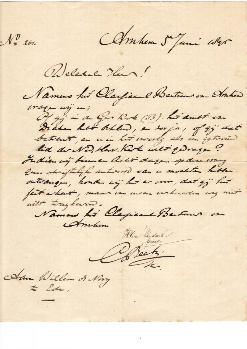 Namens het Classicaal Bestuur van Arnhem vragen wij U: of Gij in de Ger. Kerk (B) het ambt van Diaken hebt bekleed, en zoo ja, of gij dat betreurt, en U in het vervolg als een getrouw lid der Ned. Herv. Kerk wilt gedragen?