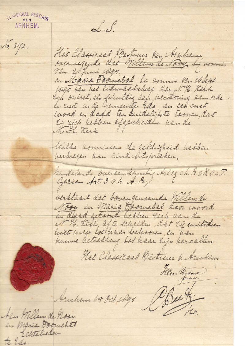 Het Classicaal Bestuur van Arnhem, overwegende dat Willem de Nooij, bij vonnis van 21 juni 1895 en Maria Doornebal bij vonnis van 18 sept. 1895 van het lidmaatschap der N. H. Kerk zijn ontzet, als schuldig aan verstoring van orde en rust in de Gemeente Ede en een [één] met woord en daad ten duidelijkste tonen, dat zij zich hebben afgescheiden van de N.H. Kerk.