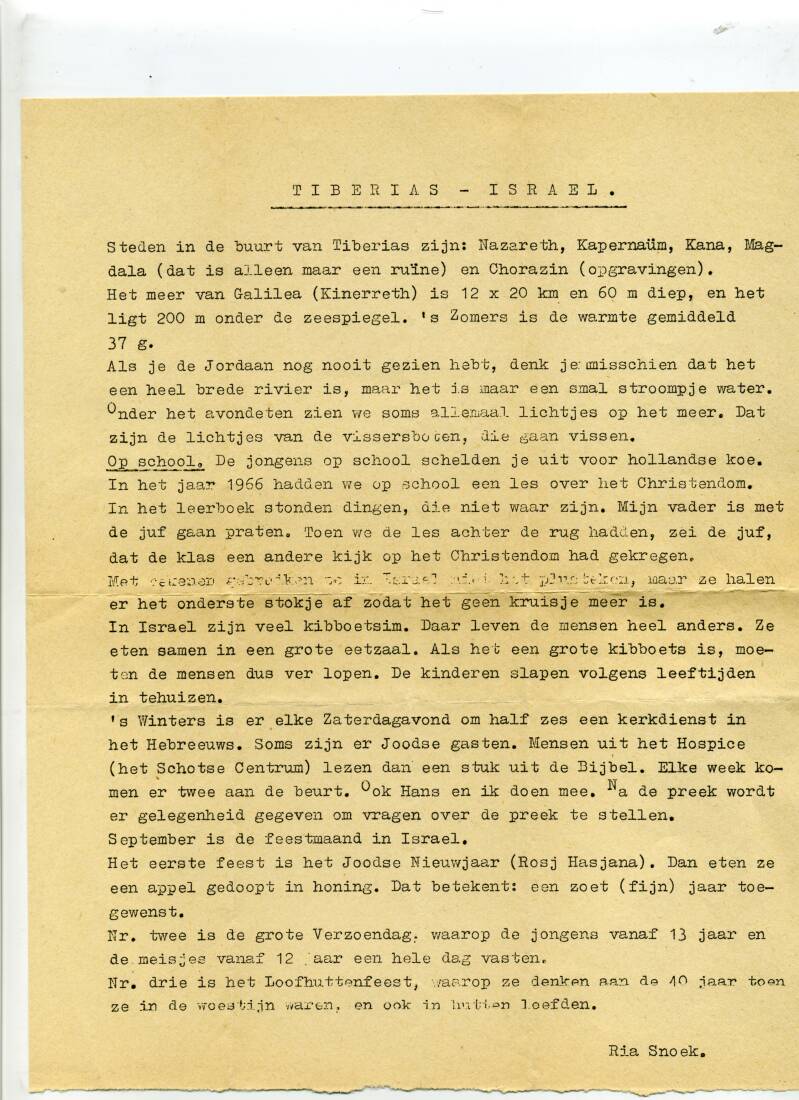 Tekst van Ria ca 1966 over wonen in Tiberias en Israel