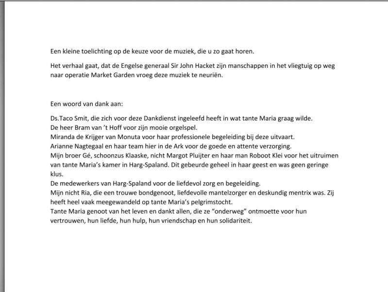 Ik vermoed dat het beeld van tante Rie dat uit deze herinneringen naar voren komt door velen van u herkend wordt en met eigen herinneringen kan worden aangevuld. Zij keek in dankbaarheid en terug op haar leven. Wij kunnen daarom in dankbaarheid en vertrouwen afscheid van haar nemen.