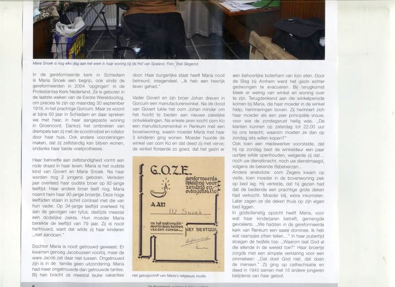 Artikel uit Tijdschrift van Schiedam , Maandblad de Binnenkant. Oom Zeverus moet zijn: oom Zwerus. Het artikel gaat over haar leven. Wat er niet meer in kon: Na Zaandam had Maria plannen om zich in Israel te vestigen, maar dat is niet gelukt, ze hoorde niets op haar sollicitatie (in een Ziekenhuis, incl opleiding tot Verpleegkundige). In het AZL (Academisch Ziekenhuis Leiden, later LUMC) vond ze haar werk als verpleeghulp erg zwaar; ze was toen blij dat haar sollicitatie in Israël niet is gelukt).