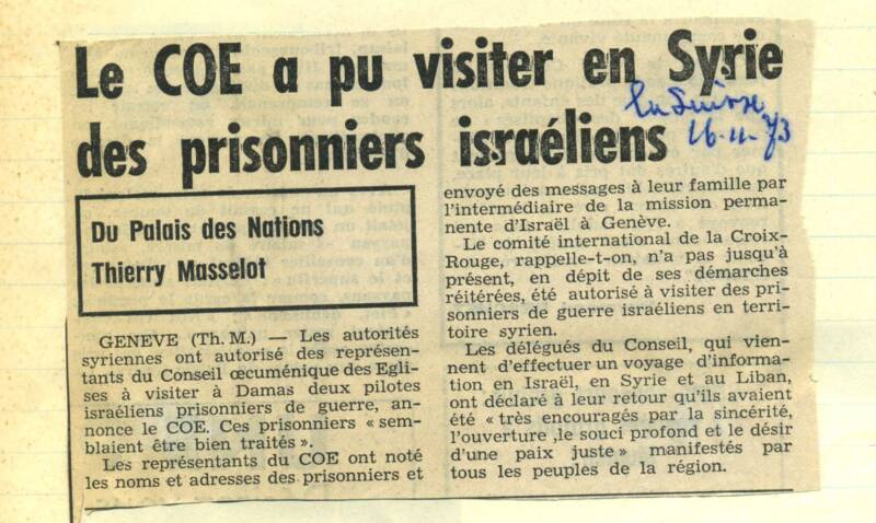 In Geneva I closely followed together with my opposite number dr. Gerhard Riegner, general secretary at Geneva of the World Jewish Congress, developments during the Yom Kippur war so I was aware of the plight of the Israeli pilots. The WCC decided to send dr. Niilus and me to Israel, the Lebanon and Syria to convey to Churches and authorities our concern and our hope that peace would prevail. In Israel we met with dr. Kidron who had been the Israeli ambassador at Geneva. He stressed the importance of investigating the fate of the pilots as the Red Cross had not yet been permitted to visit them, the Syrians refused to hand over a list with their names and they might be tortured. In Damascus we met with Church and government authorities and stressed the importance of us seeing at least two pilots. We had to postpone our return to Geneva but then permission came off.