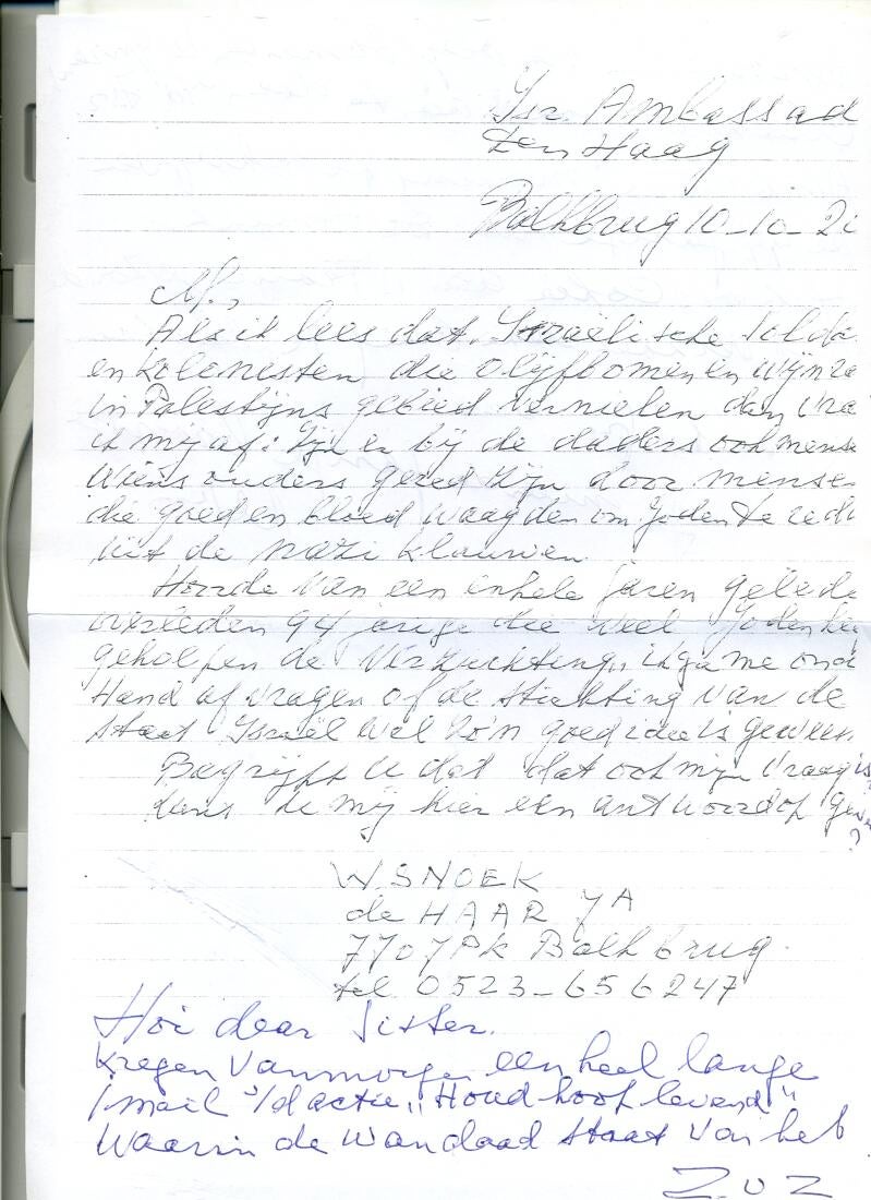 2012 Brief aan de Israelische ambassade met briefje aan zus Rie