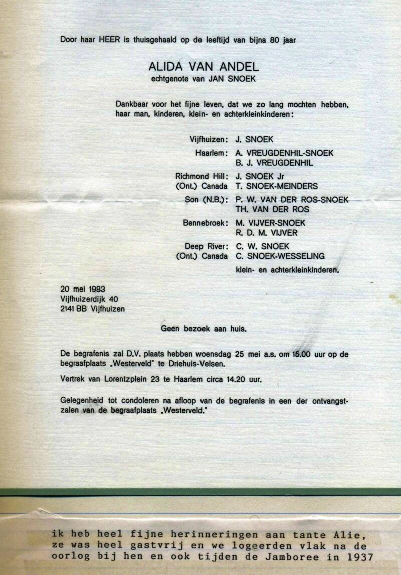 Herinnering van Rie Snoek, geb 1918, Govertdr: "tante Alie kwam kennismaken met de familie van haar vriend Jan Snoek; ze zal wel zenuwachtig geweest zijn. Ik zat te kreunen bij het breien (waar ik nooit goed in geworden ben). Alie bood aan te helpen. Ze breidde de pen af, en óók de volgende pen. Je snapt dat tante Alie bij mij niet meer stuk kon!"