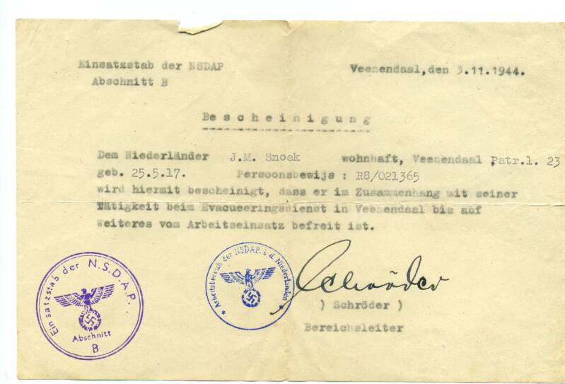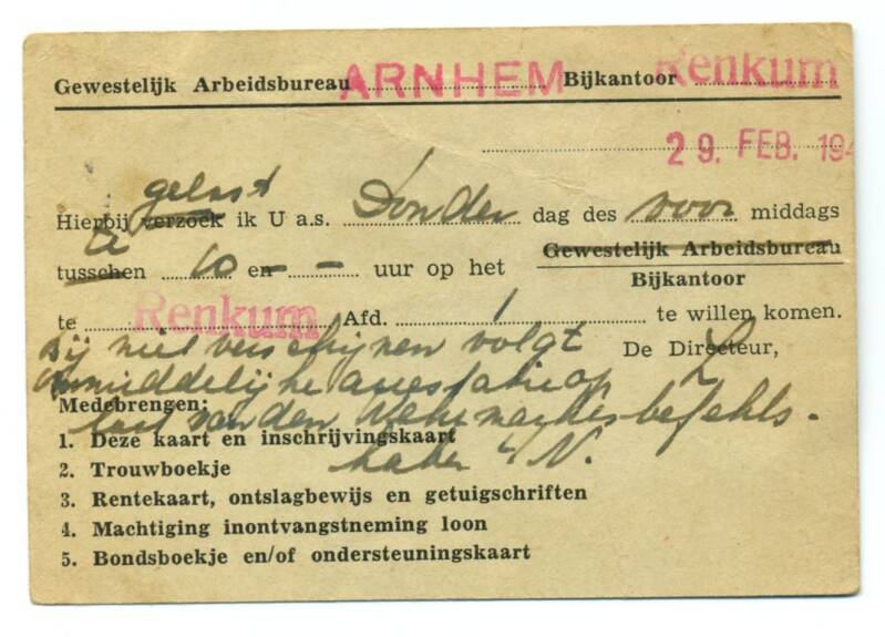 Bevel om op het bijkantoor van het Arbeidsbureau in Arnhem te moeten komen. Johan: "de oproep die mij gestuurd werd door het arbeidskantoor bijkantoor Renkum om me te melden voor werken in Duitsland. In "kleur bekennen"staat het verhaal van het tenslotte naar Arnhem gaan voor de keuring, en door de arts afgekeurd worden (voor een kilo suiker meen ik, gearrangeerd door de L.O. in Arnhem)" (