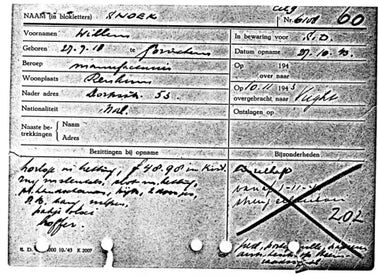 Snoek Willem, geboren 27-7-1918 te Gorinchem; Manufacturier, Renkum, Dorpsstraat 53; ingesloten op 27-10-1943; vertrokken op 10-11-43 naar Vugt; bijzonderheden - cellulair; aanschrijf adres: a.b. Geschreven per 28-10