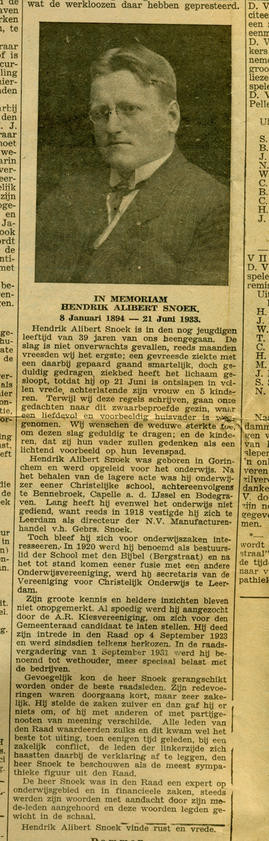 In Memoriam Hendrik Alibert Snoek uit ‘De Leerdammer’, nieuws- en advertentie blad voor Zuid-Holland en Gelderland, 24 juni 1933 Bron: album van Go Schreurs-de Nooy, map 14