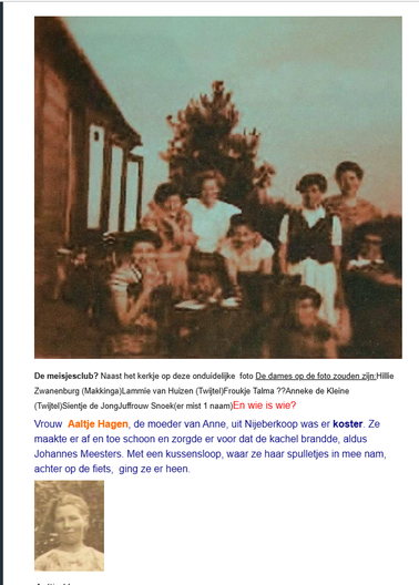 Intussen heb ik ook een website in de lucht over het buurtschap en daarop wordt ook de geschiedenis van het kerkje belicht. (www.twijtel.jouwweb.nl). Een paar extra foto’s zouden daarop zeker niet misstaan. Als u nog verdere aanvullingen heeft aangaande uw tante en haar werkzaamheden daar, dan houden wij ons uiteraard zeer aanbevolen.